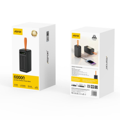 ظرفیت پاوربانک خورشیدی فضای باز: 60000 میلی‌آمپر ساعت 222 وات ساعت ورودی USB-C: 5V-3A/9V-2A/12V-1.5A خروجی USB-A1: 5V-3A/9V-2A/10V-2.25A/12V -1.5A خروجی USB-A2: 5V-2.1A خروجی USB-C: 5V-3A/9V-2A/10V-2.25A/12V -1.67A خروجی کابل USB-C: 5V-3A/9V-2A/10V-2.25A/12V -1.67A خروجی کابل iPh: 5V-2.1A ورودی USB-A: 5V-2A
